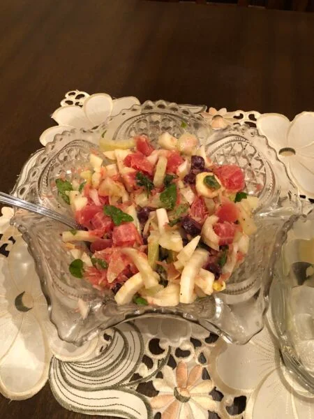 The sunset salad is a mixture of blood oranges, fresh fennel, black olives, and mint. I loved it – Rob not so much. I liked the licorice flavor of the fennel.