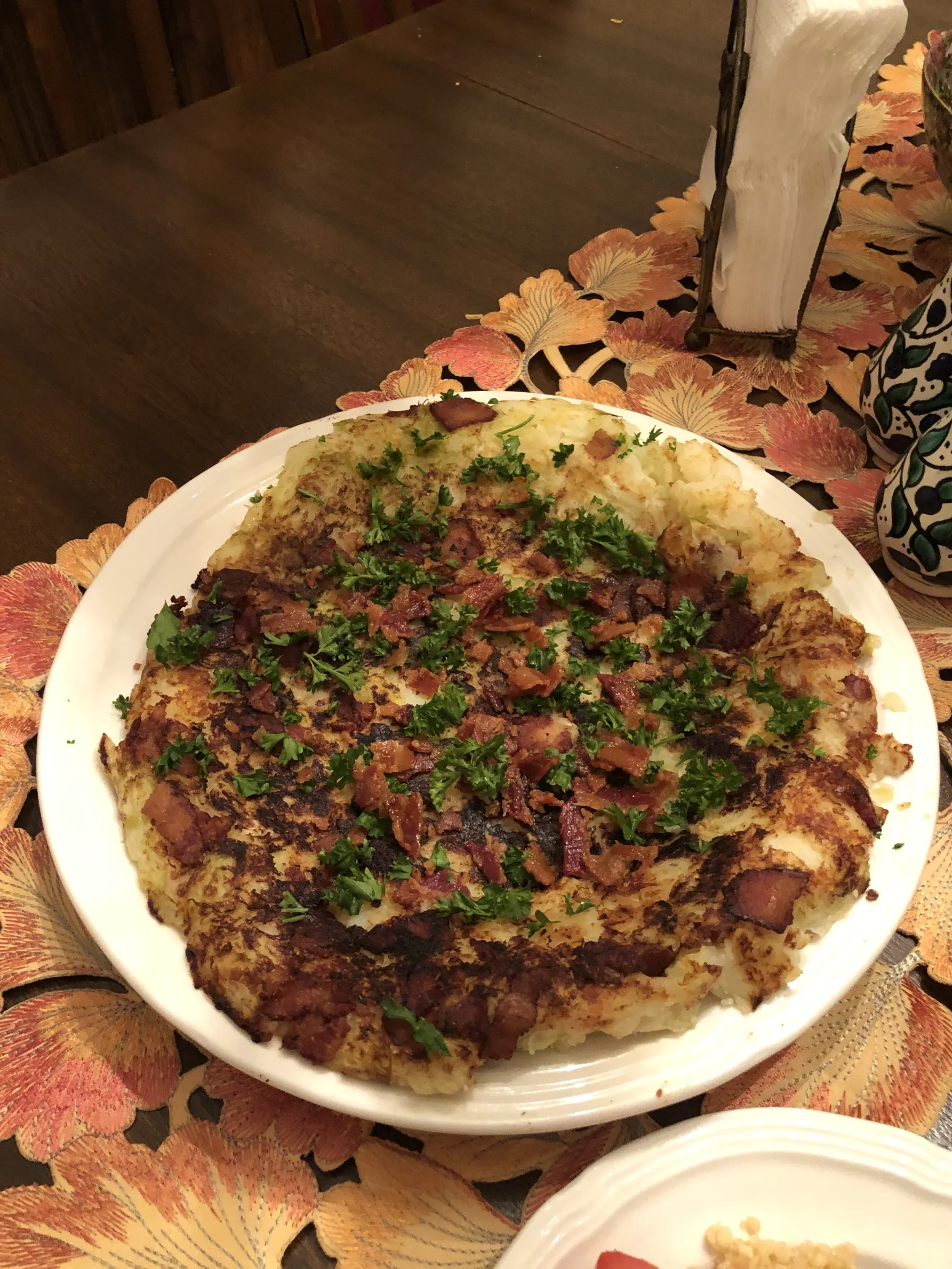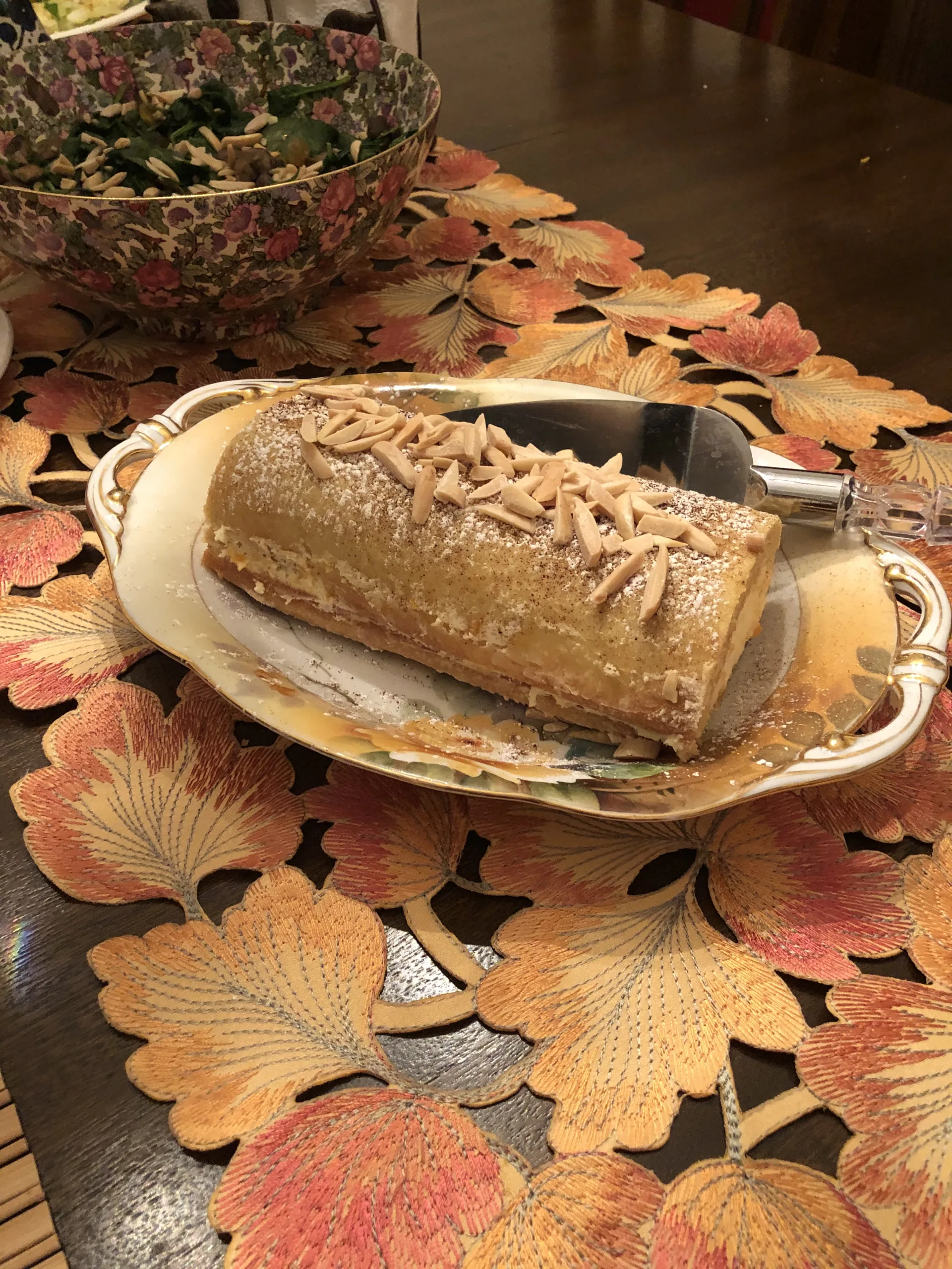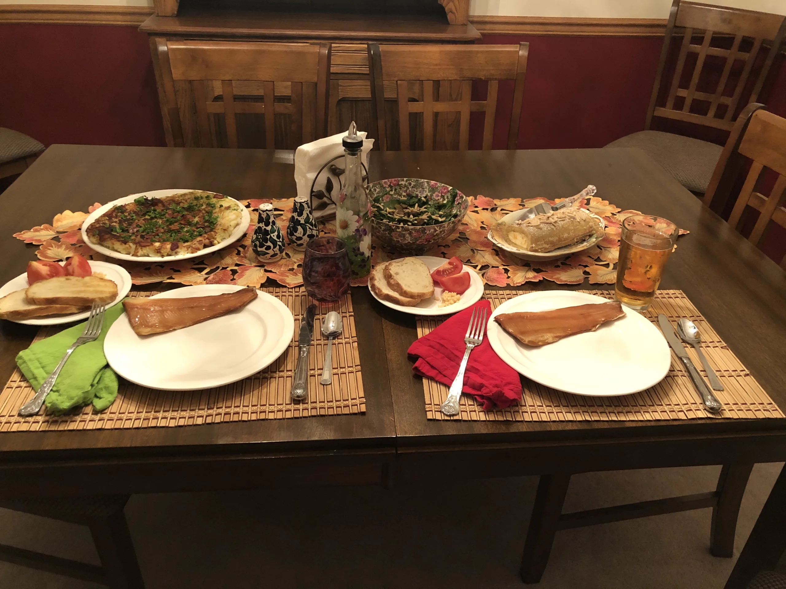 We enjoyed the smoked trout – we had never tried smoked trout before. The cabbage on top of potatoes was an interesting combination. We probably would have liked it better if the potatoes were more crispy. We don’t fry in oil often so probably not as crispy as they should be. The bread was like a lightly seasoned garlic bread with tomatoes on top – delicious! Since I am not much of a baker, I was happy with how the cream roll turned out! Creamy in the middle, rolled in dough, and sprinkled with slivered almonds.