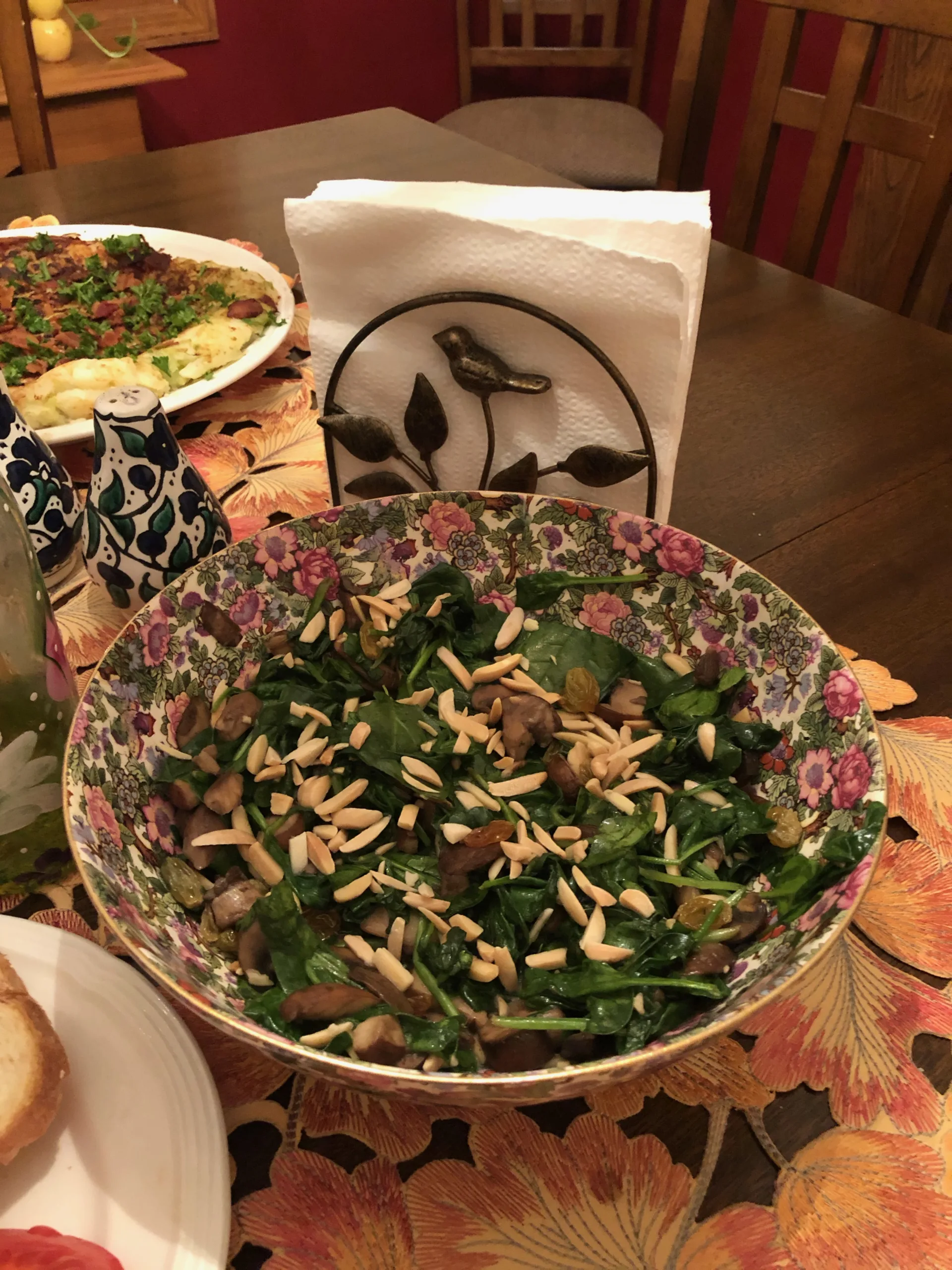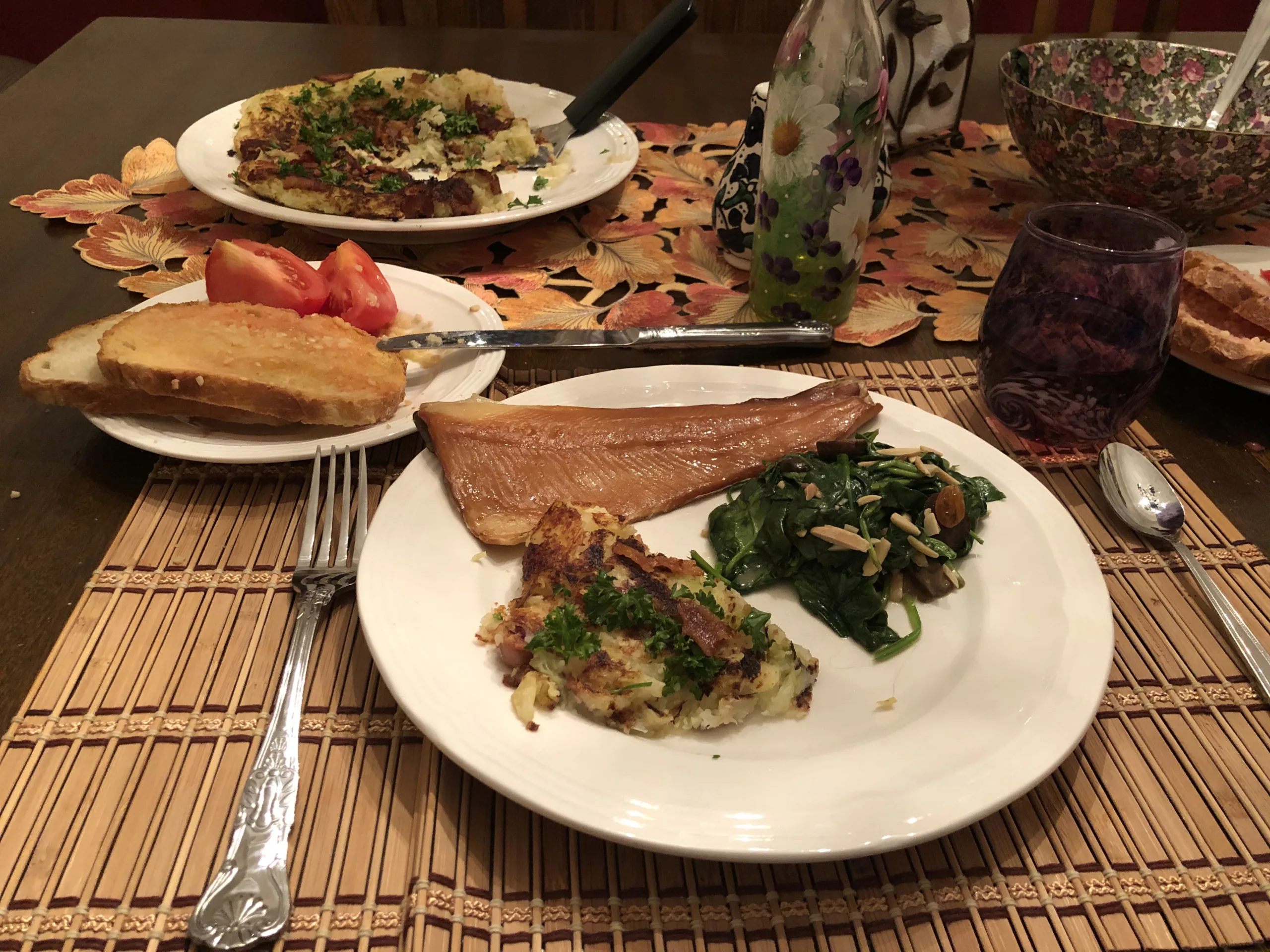 Monday night’s Gura Global Grub country was Andorra. The meal consisted of smoked trout (the meal called for grilled trout, but we had problems finding fresh trout locally), trinxat (basically a large potato pancake with cabbage and bacon), warm spinach and mushroom salad with slivered almonds and raisins, Pa amb Tomaquet (bread with tomato and garlic), and Brac de Gitano (a cream roll) for dessert.