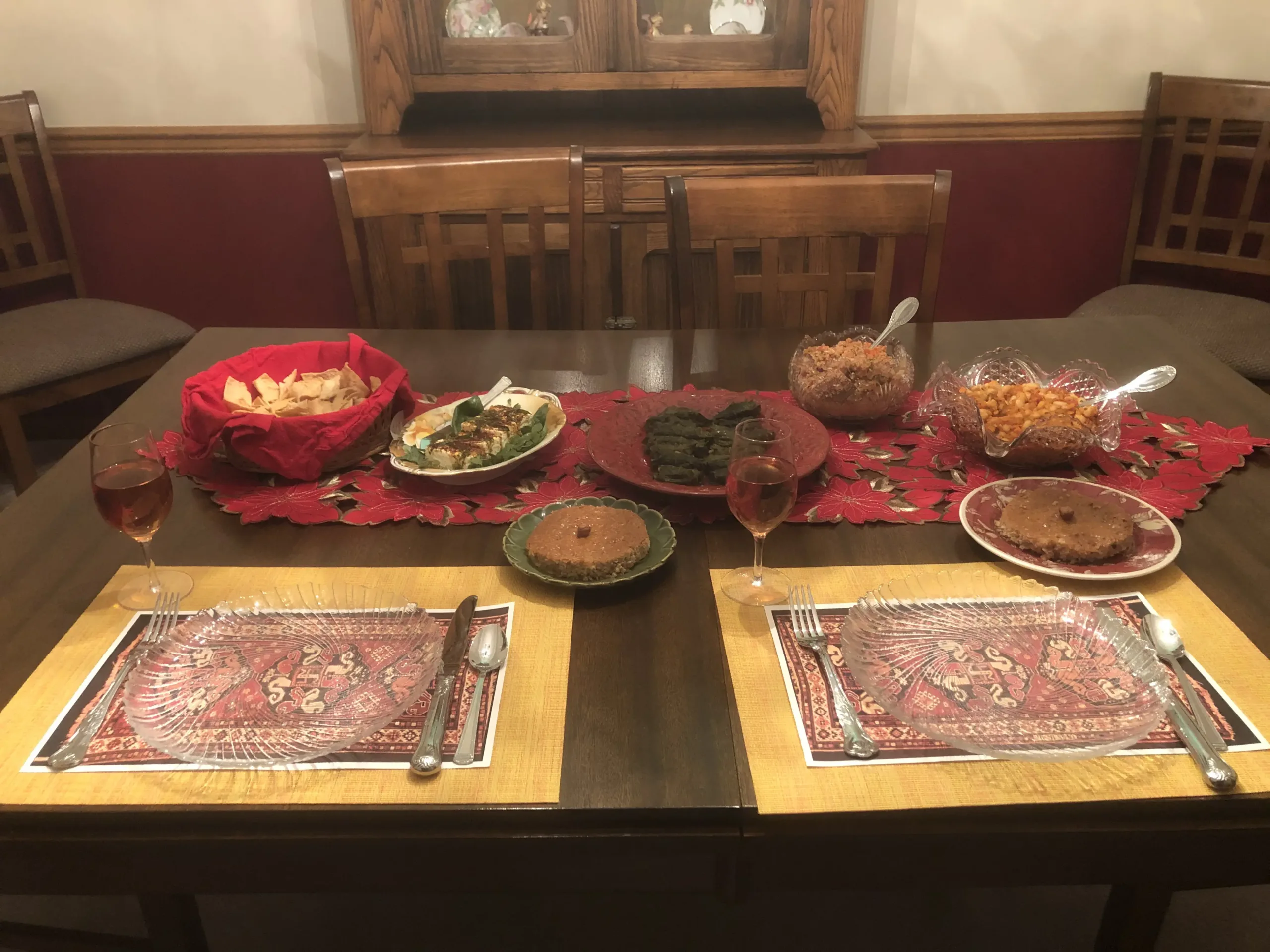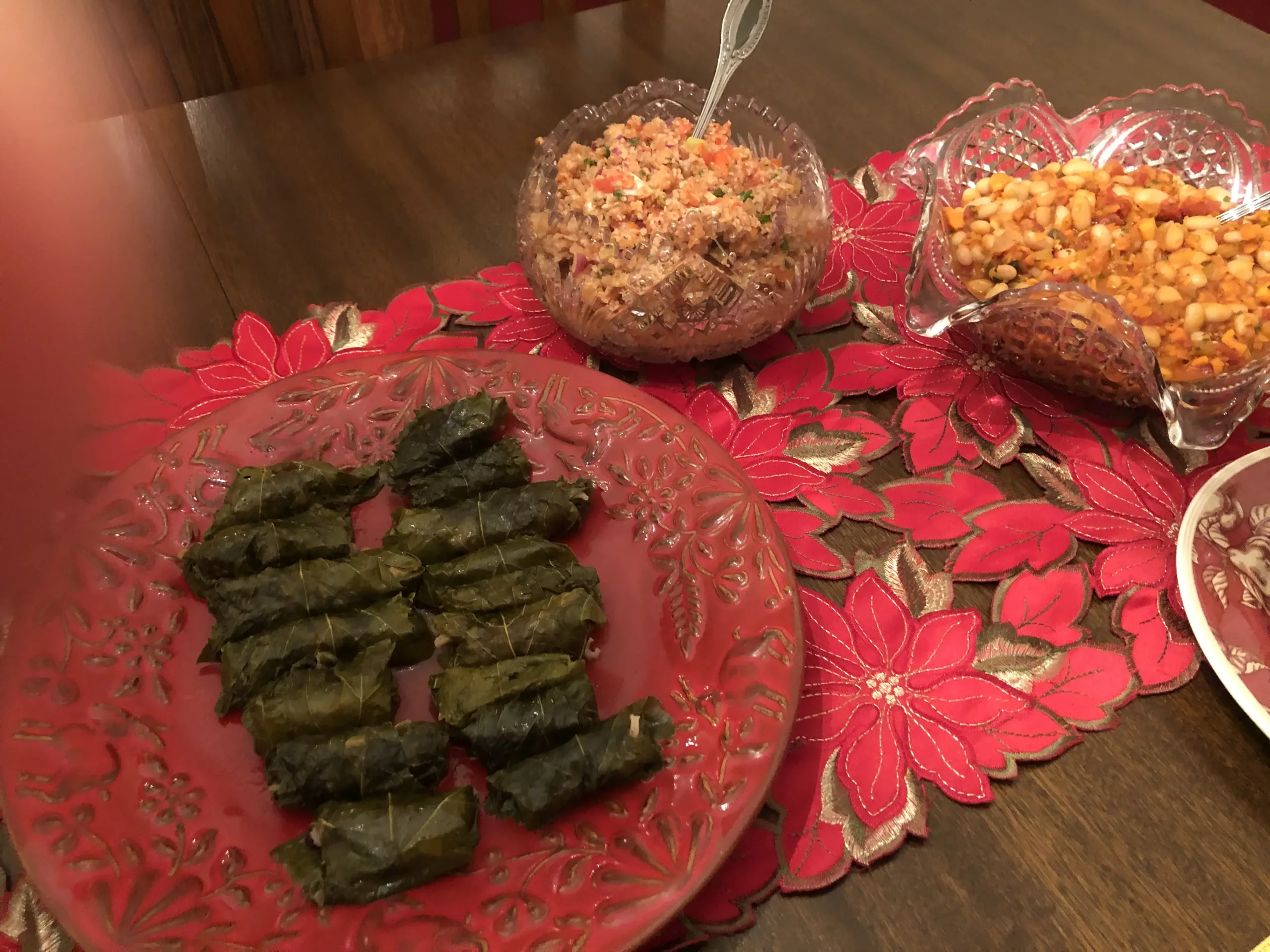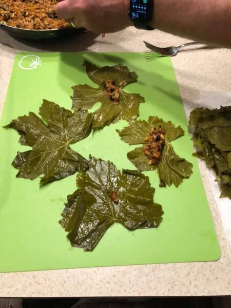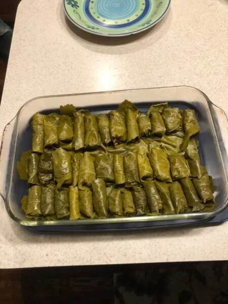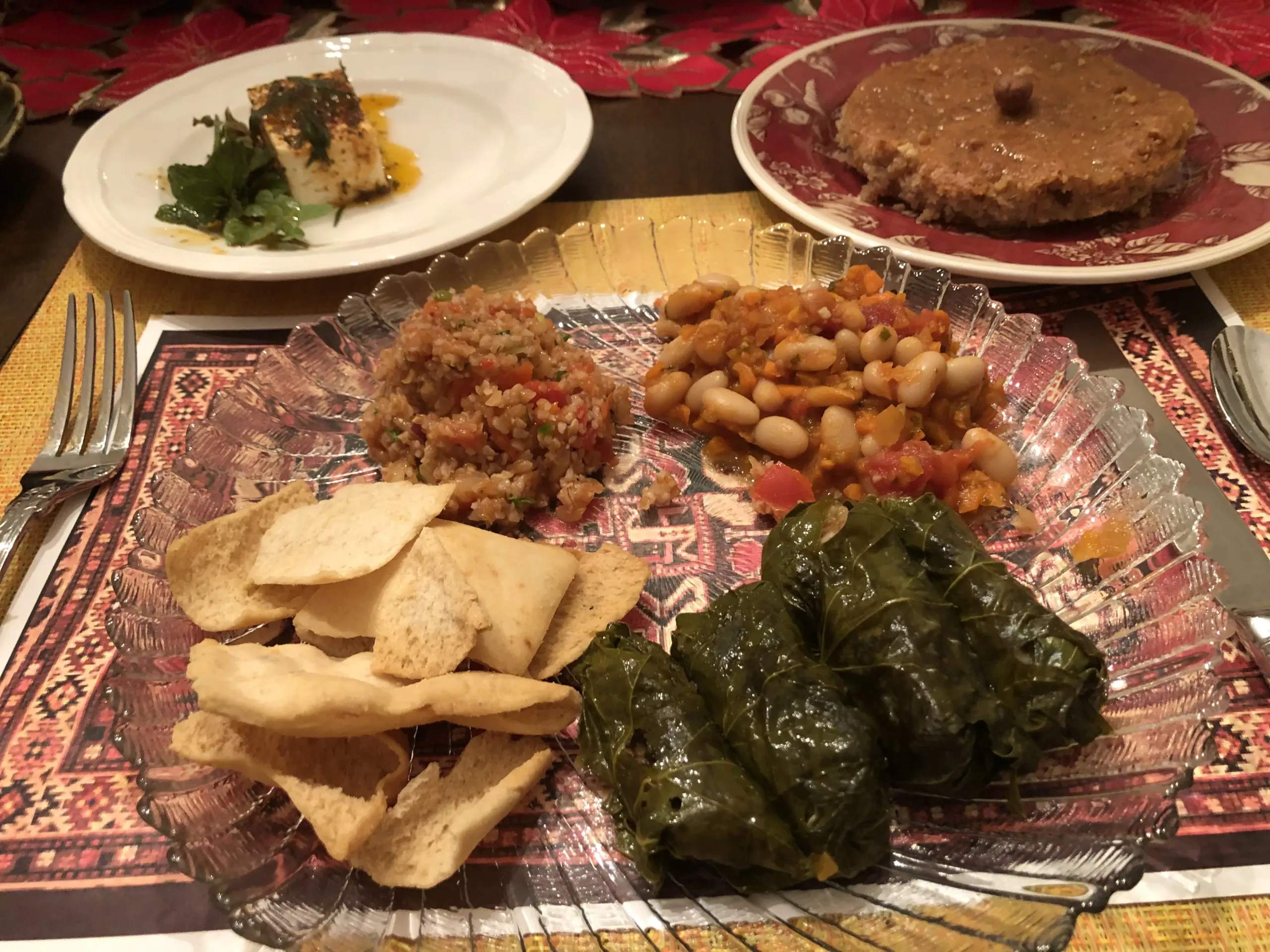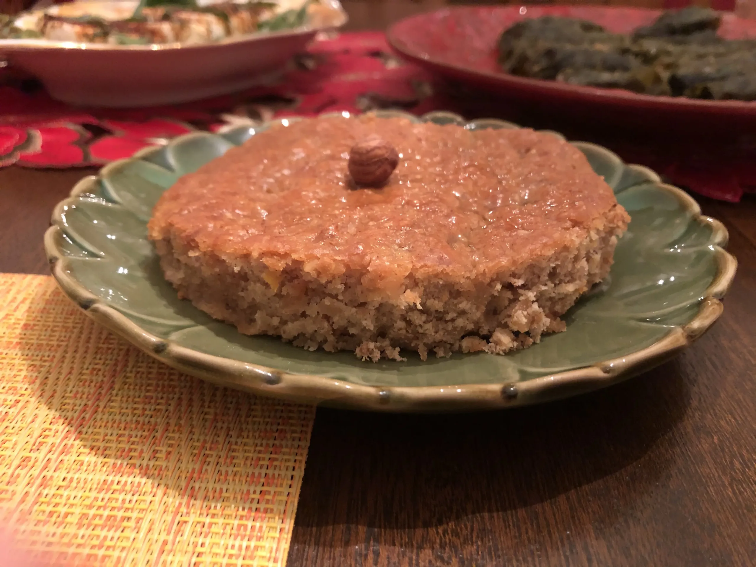 Last weekend’s meal was from Armenia: Armenian Stuffed Grape Leaves (Yalanchi Sarma), Armenian Spiced Feta (Brinza), Armenian Bulgur Pilaf Salad (Itch), Armenian White Bean (Lupia Plaki), and Armenian Hazelnut Cake in Honey Syrup (Revani).