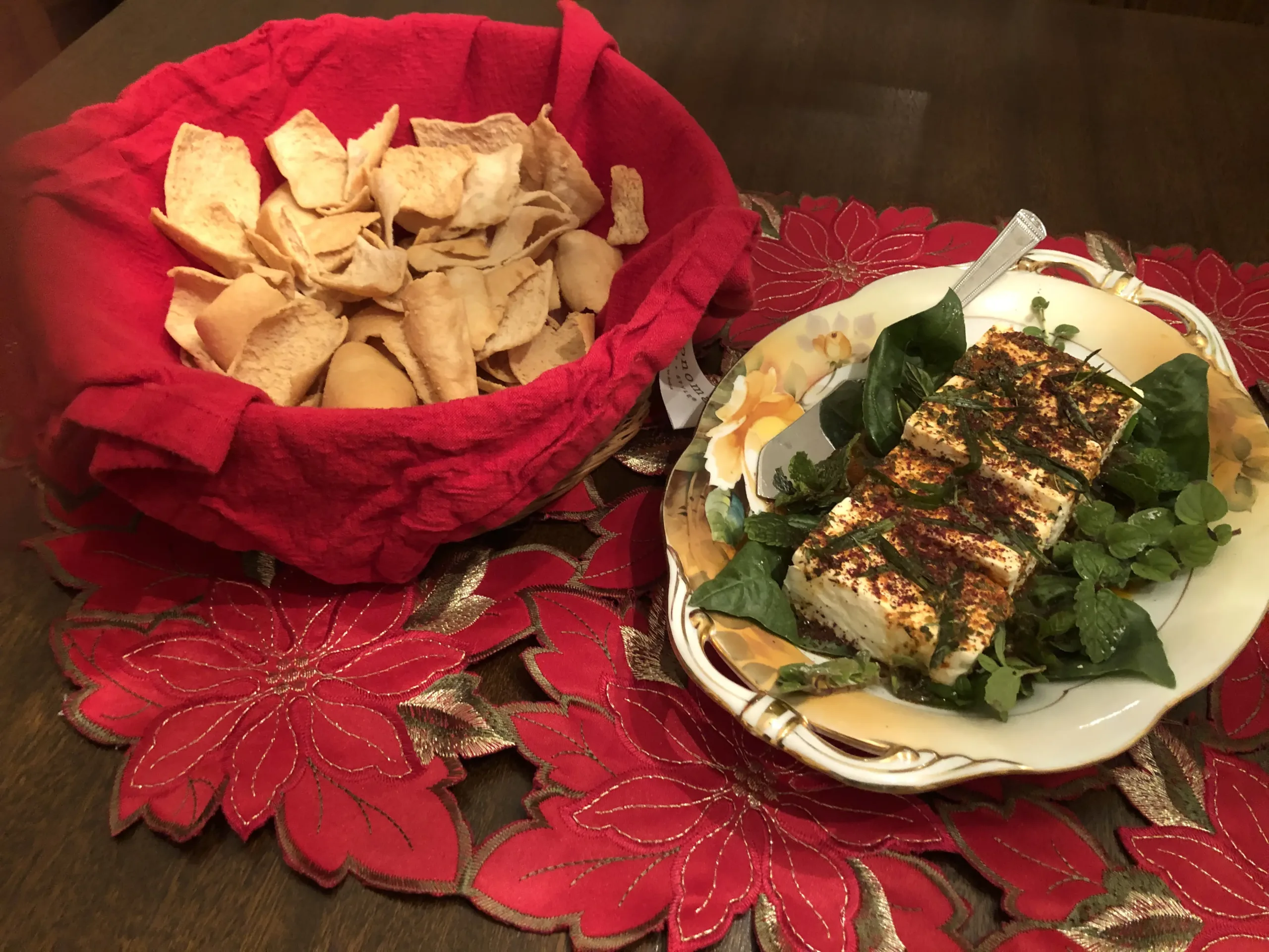 We both liked the stuffed grape leaves. They were a little sweet from the currants, cinnamon, sugar and Allspice. Brinza was feta set on top of fresh basil, chives, mint and oregano covered in oil and vinegar mixed with a bunch of dried spices and sprinkled with sumac. Every bite was a little different depending on which fresh herbs you ate with the cheese. Delicious. I kept thinking this could be made on four separate plates so everyone would have their own little appetizer (Covid on the brain?).