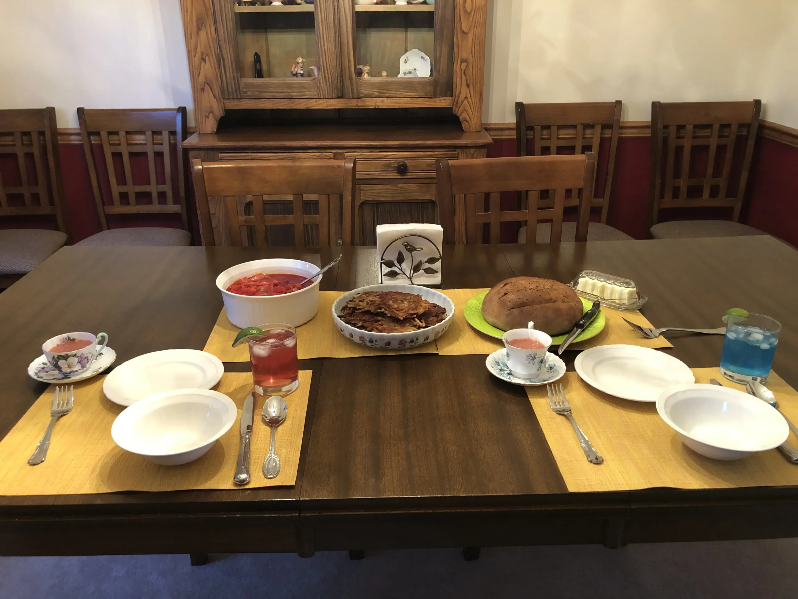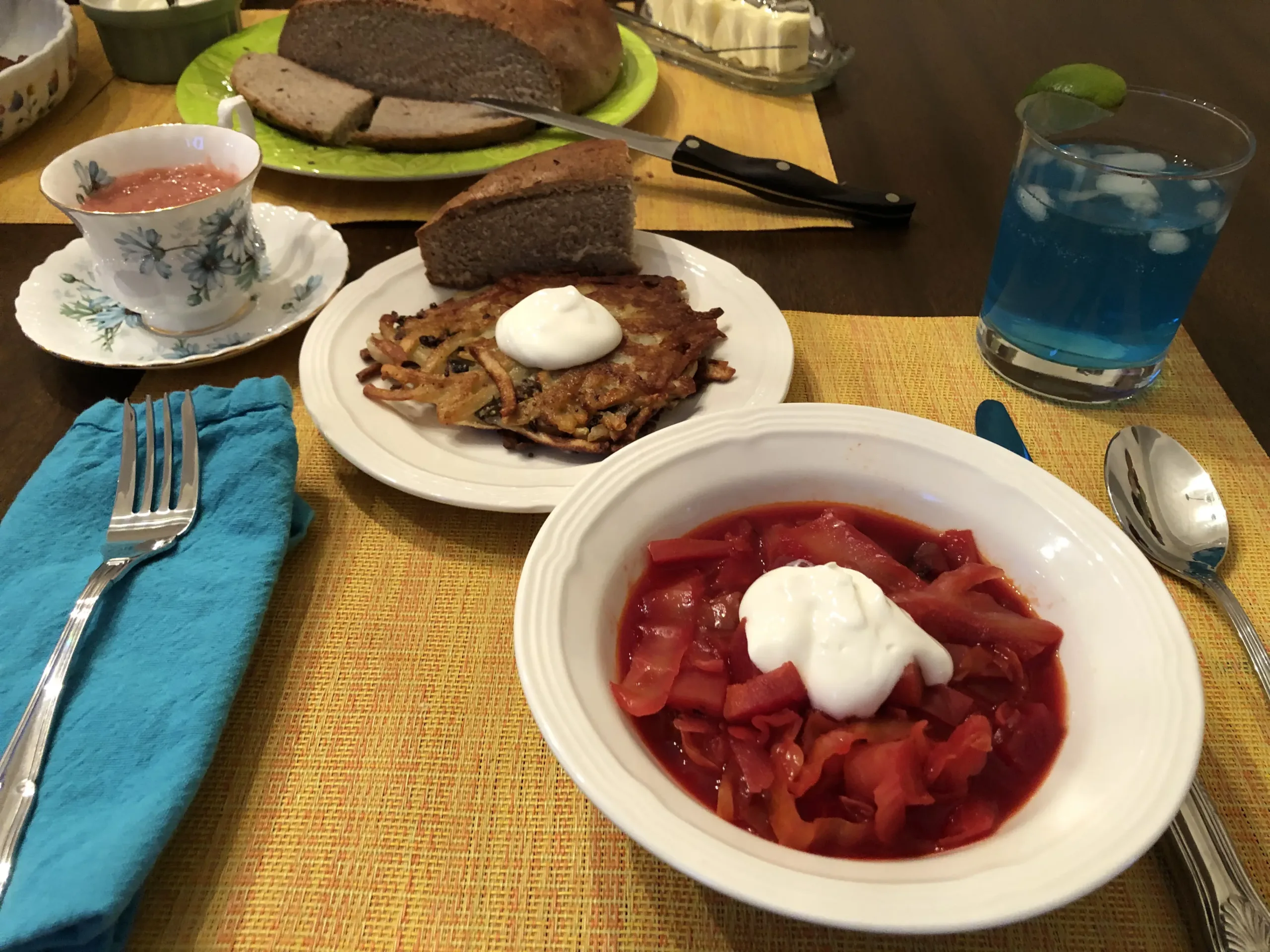 The meal consisted of Borscht Soup (Beet Soup with potatoes), Mushroom stuffed Draniki (Potato Pancakes/hash browns stuffed with mushrooms), Rye Bread and Strawberry Kisiel (Thick Strawberry Puree).