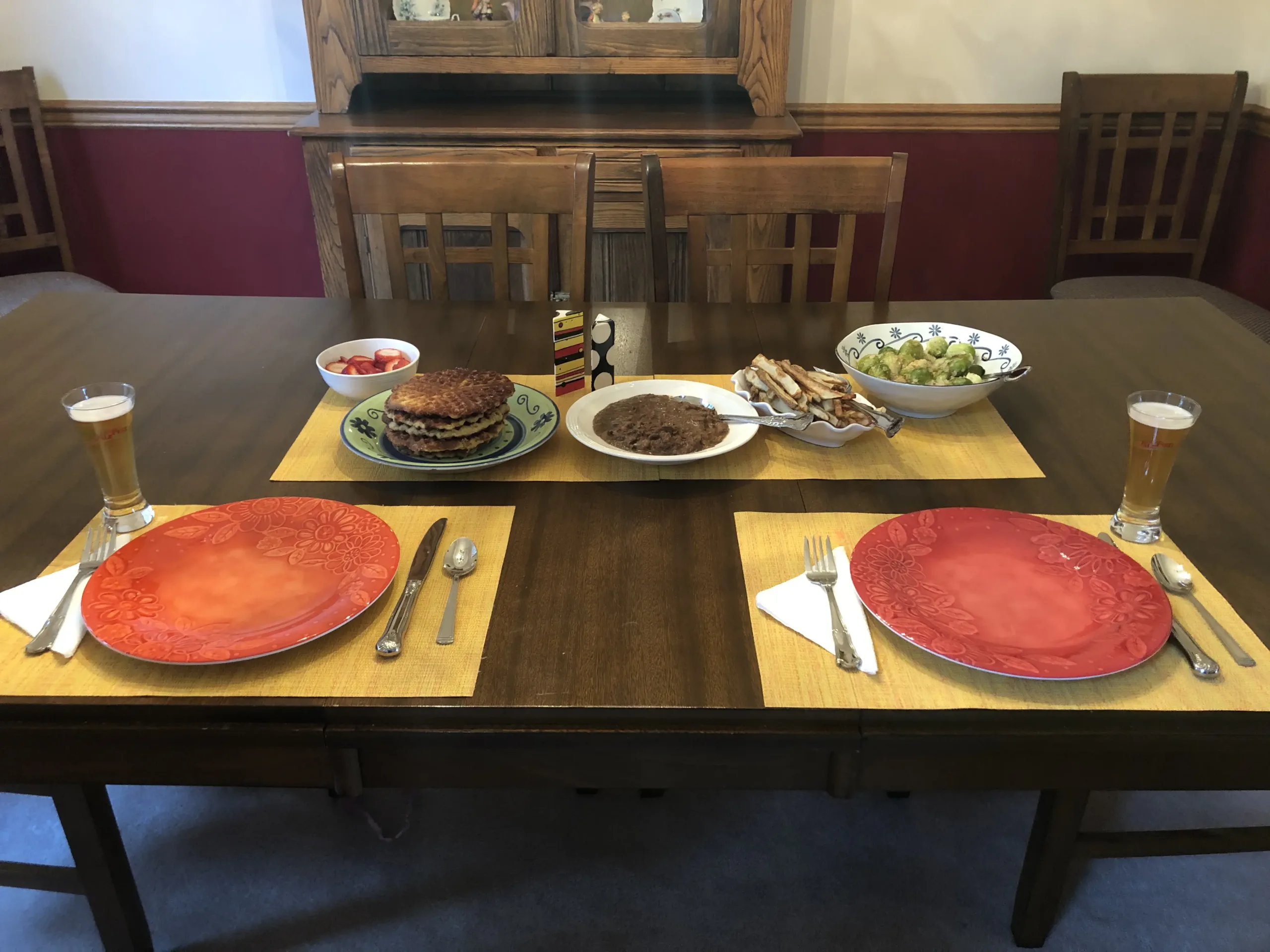 Our Belgium meal was Stoofvlees (Flemish Stew), Pommes Frites (French Fries), Flemish SautΓ©ed Brussels Sprouts and Waffles from Liege. All very good even though the Flemish stew doesnβt look too appetizing in the picture. My favorite part of the meal was the waffles topped with strawberries and whipped topping! Another leftover I will be eating for breakfast! Yum! During our stay in Belgium in 2017 I had a meal similar to what we made for our global meal. We didnβt realize this until we looked through pictures from our trip!