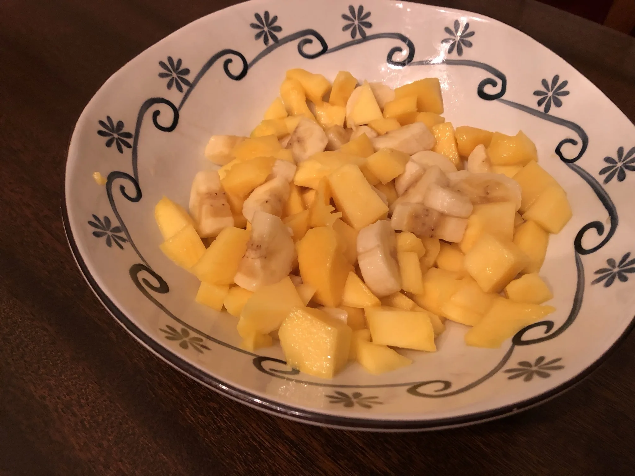 Our Bhutanese meal consisted of Ema Datshi, Cracked red rice, Butter Grilled Poblanos, Himalayan inspired fruit salad, Butter Tea and Kheer. Ema Datshi is the national dish in Bhutan made with an assortment of ema (chilis) and datshi, which is cheese made from yak or cow’s milk. Our Ema Datshi was made with Anaheim and Serrano peppers with Monterey Jack and Farmers cheeses. We were fresh out of yak cheese ;). I’m not sure we got it quite right because the water and melted cheese didn’t blend together. It was still delicious over the red rice.