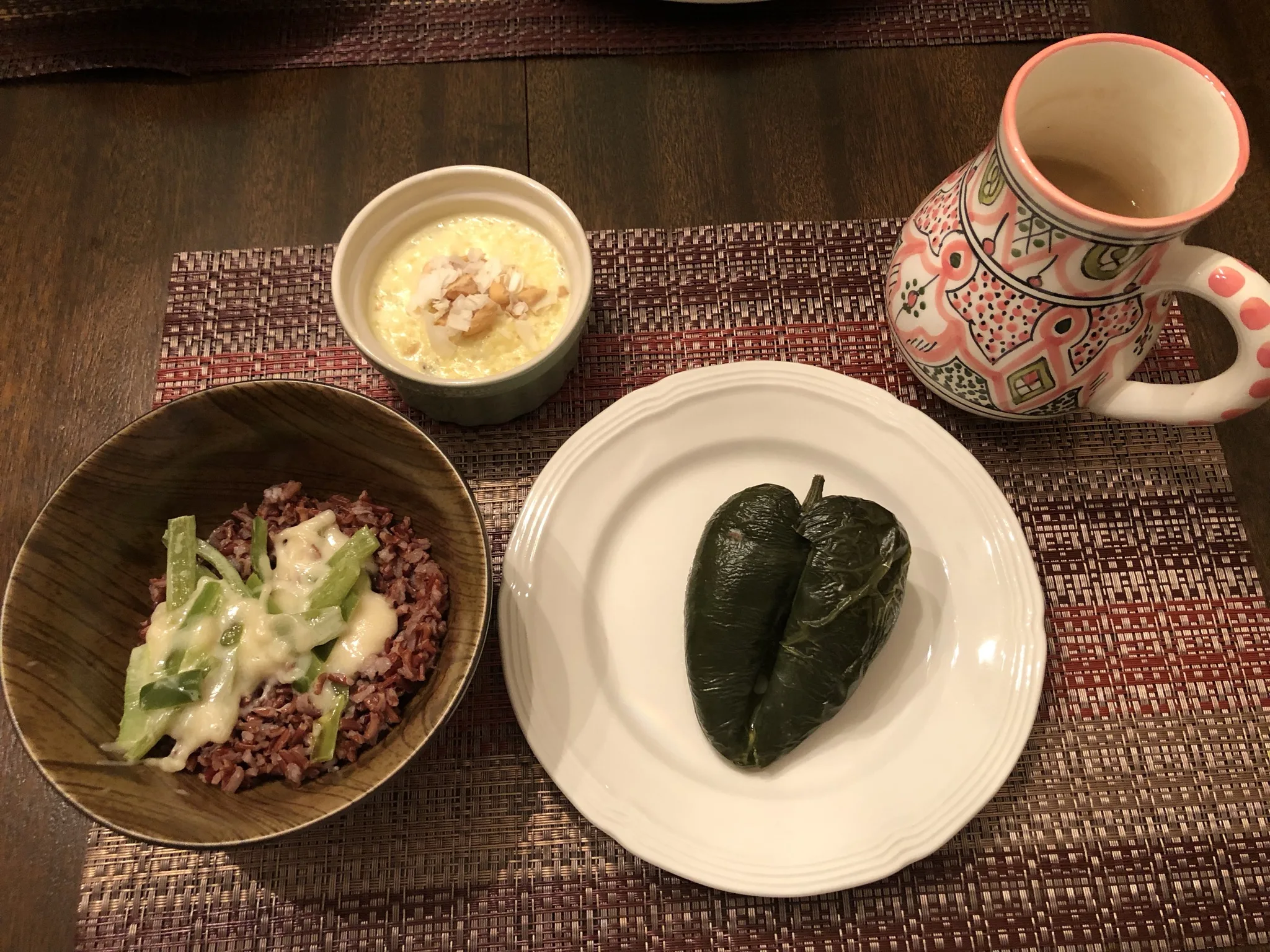 The Butter Grilled Poblano peppers were a pat of butter inserted in a slit on the side of the pepper and grilled until slightly blackened. We cut them open and let the butter run onto the red rice. A simple side dish we plan to make again. Butter tea is black tea with a pat of butter and milk. Again no Yak milk on hand so we had to use cow’s milk. I liked it so much that sometimes I now have Butter Tea in place of my morning coffee. Kheer is a rice pudding with cardamon, cashews, almonds, and coconut.