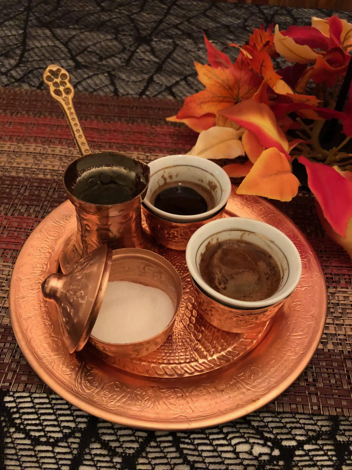 We purchased authentic Turkish coffee from Sultan Foods and Deli, a local middle eastern grocery store. We love the Turkish coffee set and the coffee was delicious! One small cup and we were good to go!! Our coffee didn’t have enough froth – we just need more practice.