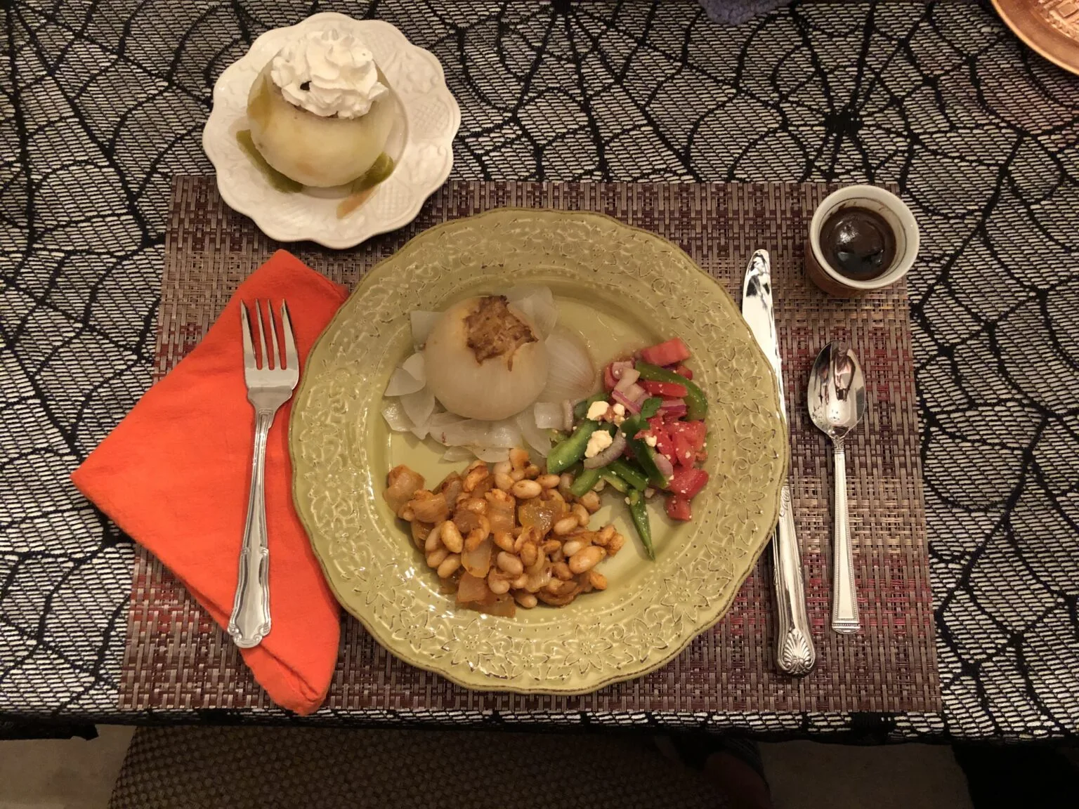 Our Bosnia and Herzegovina meal consisted of Shopska Salata (Shopska Salad), Sogan Dolma (Beef-Stuffed Onions), Prebranac (Balkan Baked Beans), Tufahije (Walnut Stuffed Apples) and Authentic Bosnian Coffee. This was one of my favorite Global meals. The leftover stuffed apples and Turkish coffee were delicious for breakfast.