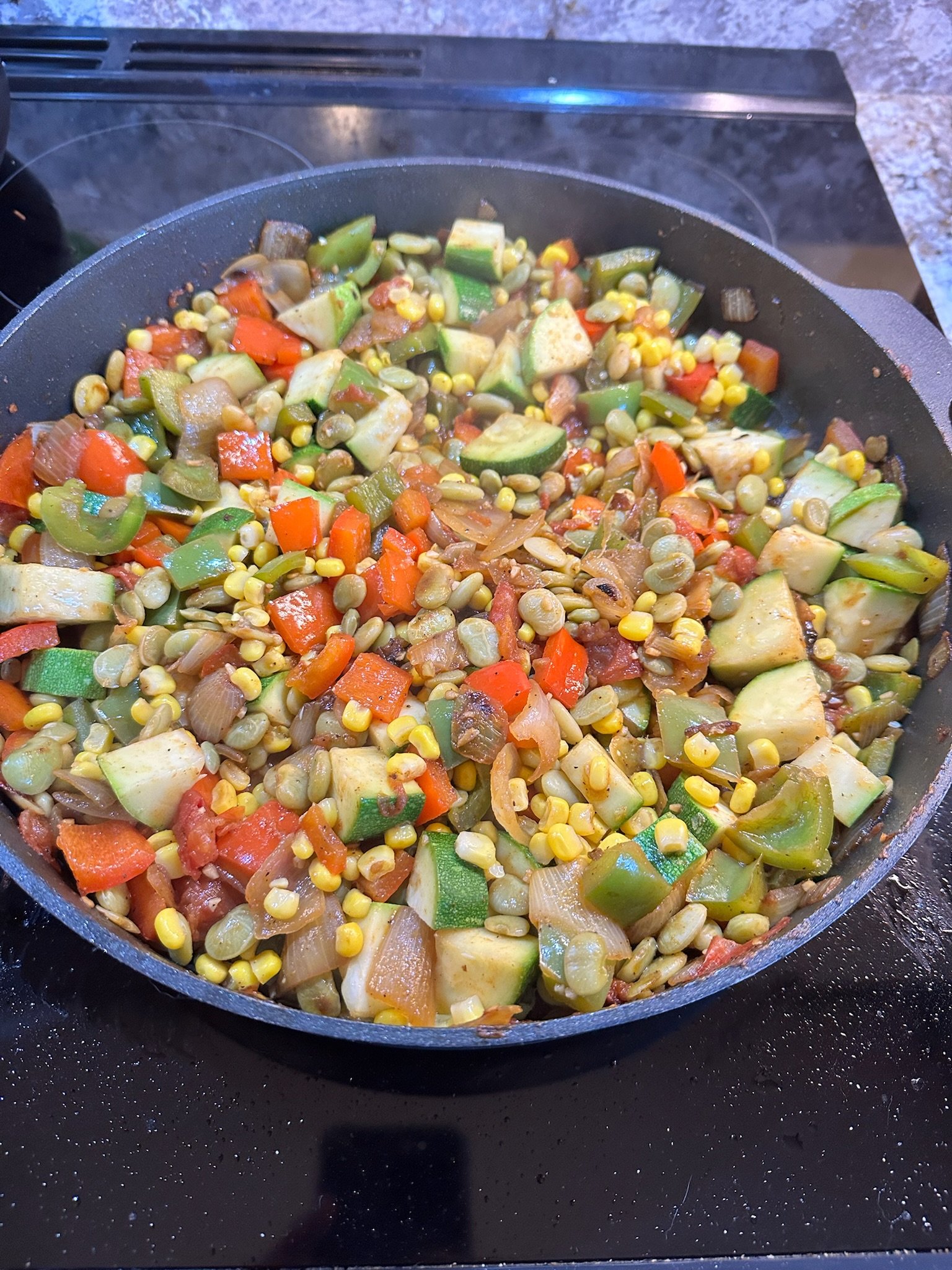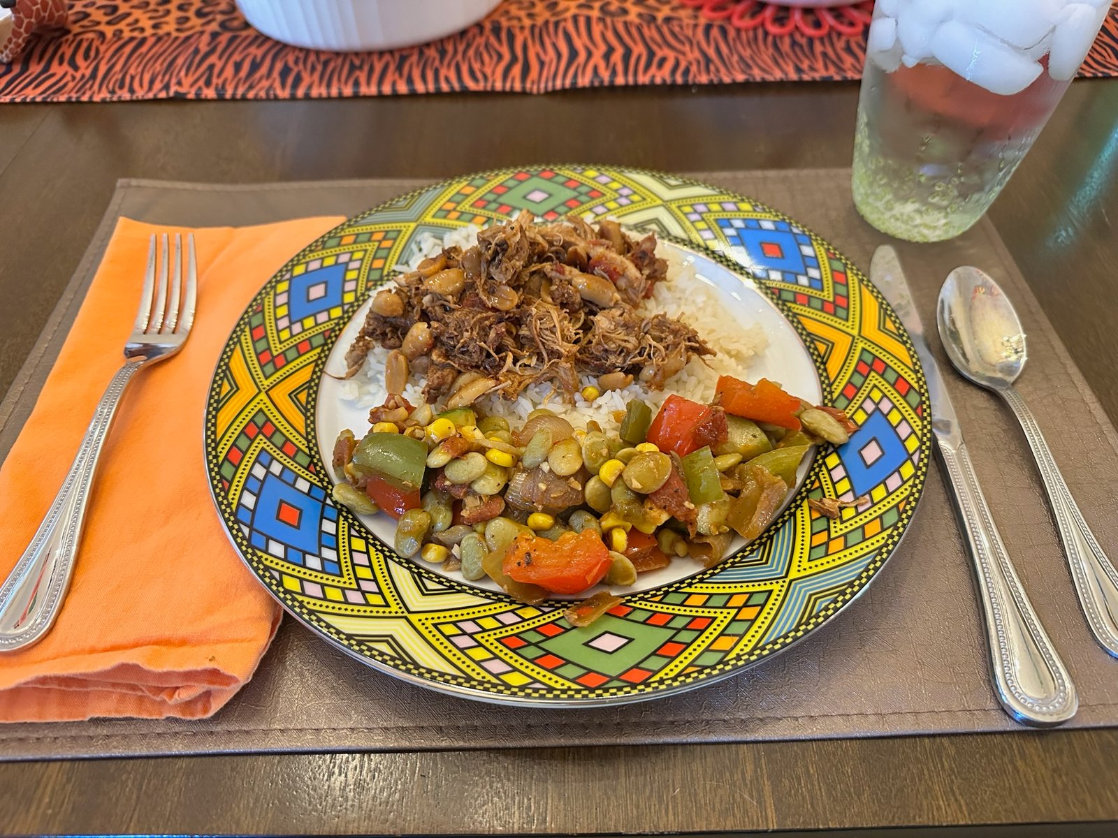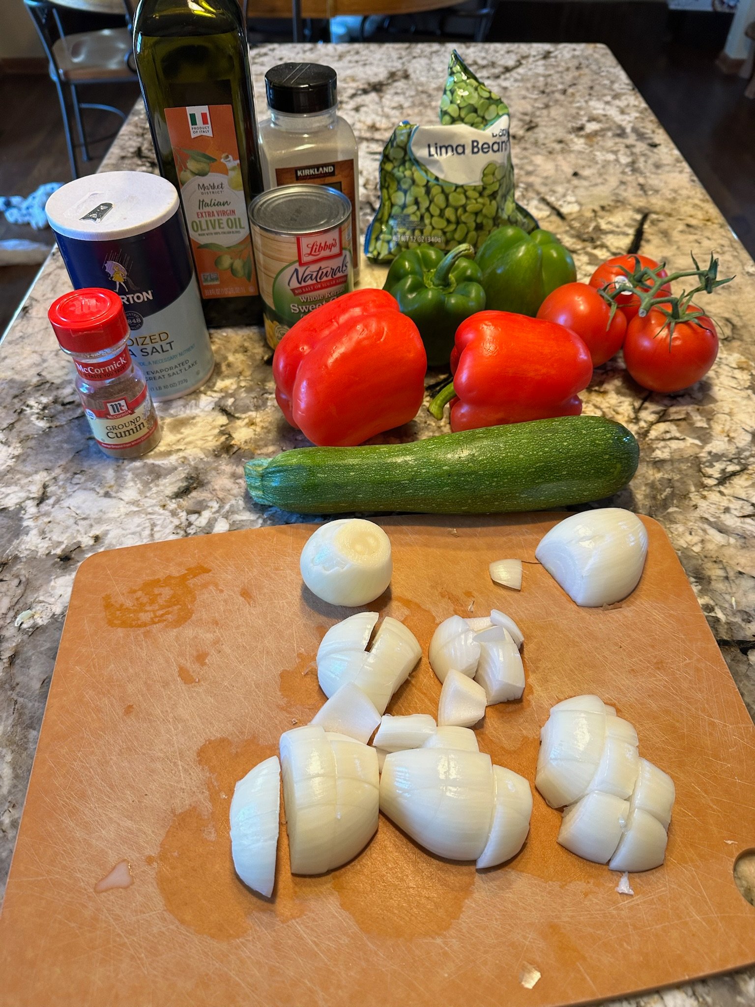 I was not excited about making Succotash because I hate the texture of lima beans, which honestly I have not tried since I was a kid. One of those things that is probably delicious when prepared the right way or swimming in butter. But I decided to give it a try because Succotash is considered the national dish of Equatorial Guinea, even though its origin can be traced back to Native Americans in North America. The succotash was pretty good! Even the lima beans were good mixed in with everything else. It consisted of a lot of different vegetables: red and green bell pepper, tomatoes, onion, zucchini, sweet corn, green beans with some garlic and cumin.