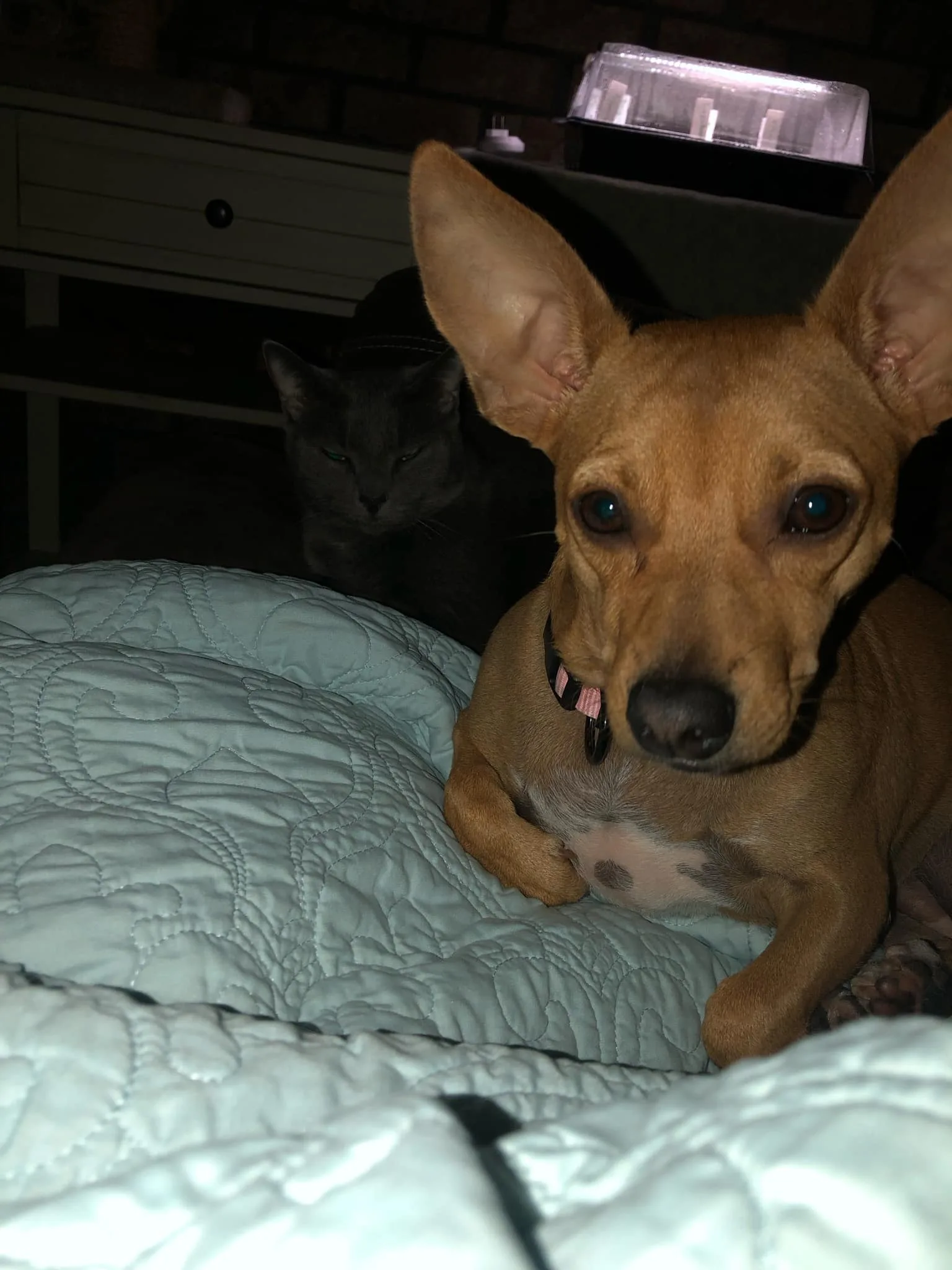 Honey is still adorable! Her ears are always standing up, even when she sleeps. Sometimes she puts them back, but most of the time they’re at attention! LOL! Her mom says she’s so cute and sweet, and they absolutely love her. She has a cat brother that she plays with all day. She’s 24 pounds now.