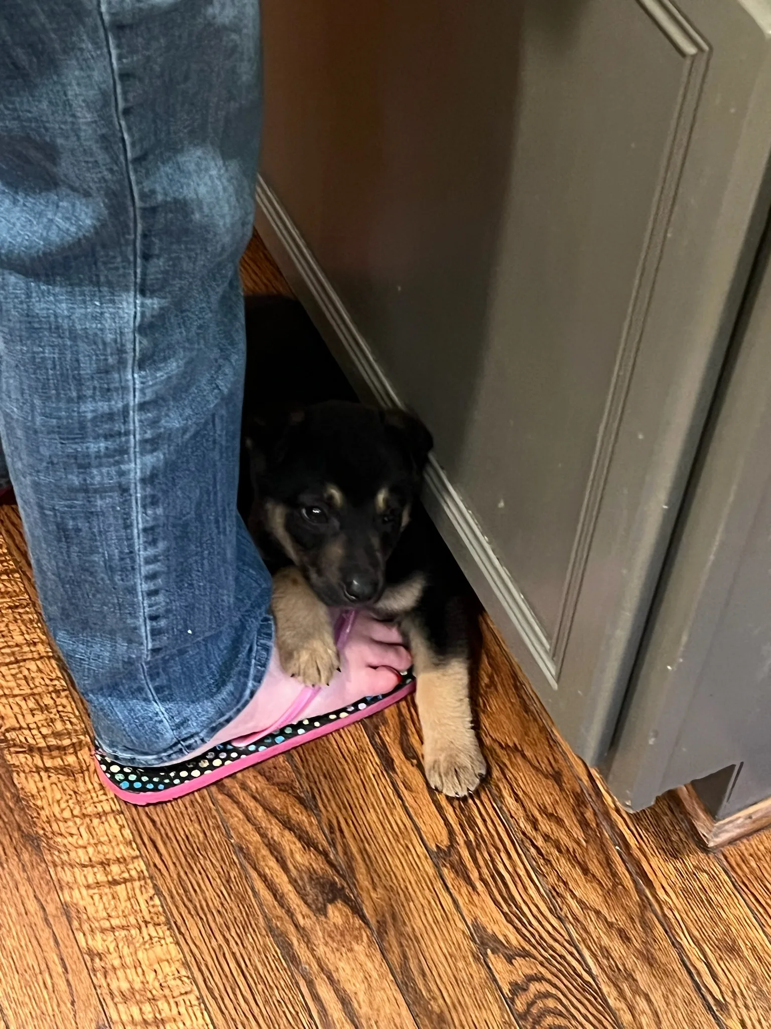 Our dog Lily is 14 years old. She is pretty good about tolerating the puppies but Bella is the first one she wanted to play with and didn’t mind laying with! In the first video, Bella is harassing Lily through the pen! Stinker. In the last two videos of Lily and Bella playing you can hear the exercise video we were supposed to be doing in the background. I chose to record a video of Lily and Bella playing instead. ๐คฃ