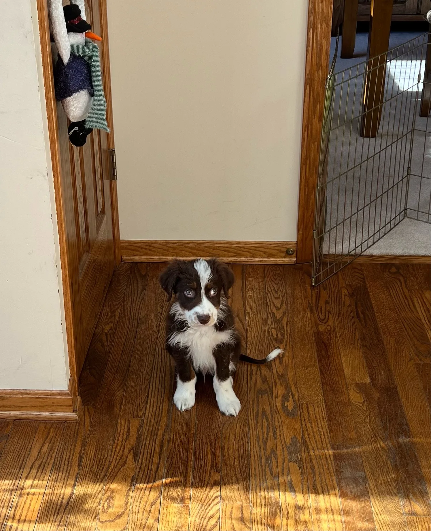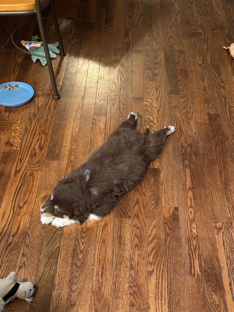 Colton got sick (we think from coccidia). He would not eat or drink and just lay in his bed not wanting to move. It is scary when puppies get sick because they can go downhill so fast. Once we got some fluids in him he turned around pretty quick. The day he started to feel better, I was sitting in the front room with him while I was working and I went to the kitchen to get some water. When I came back Colton had come out of the front room and was sitting in the entryway. He looked a little rough but it was the first time he moved out of the bed in 3 days! I cried, more like sobbed, I was so happy. I told him he just made me the happiest person in the world. Later that day he played tug with Mollie!