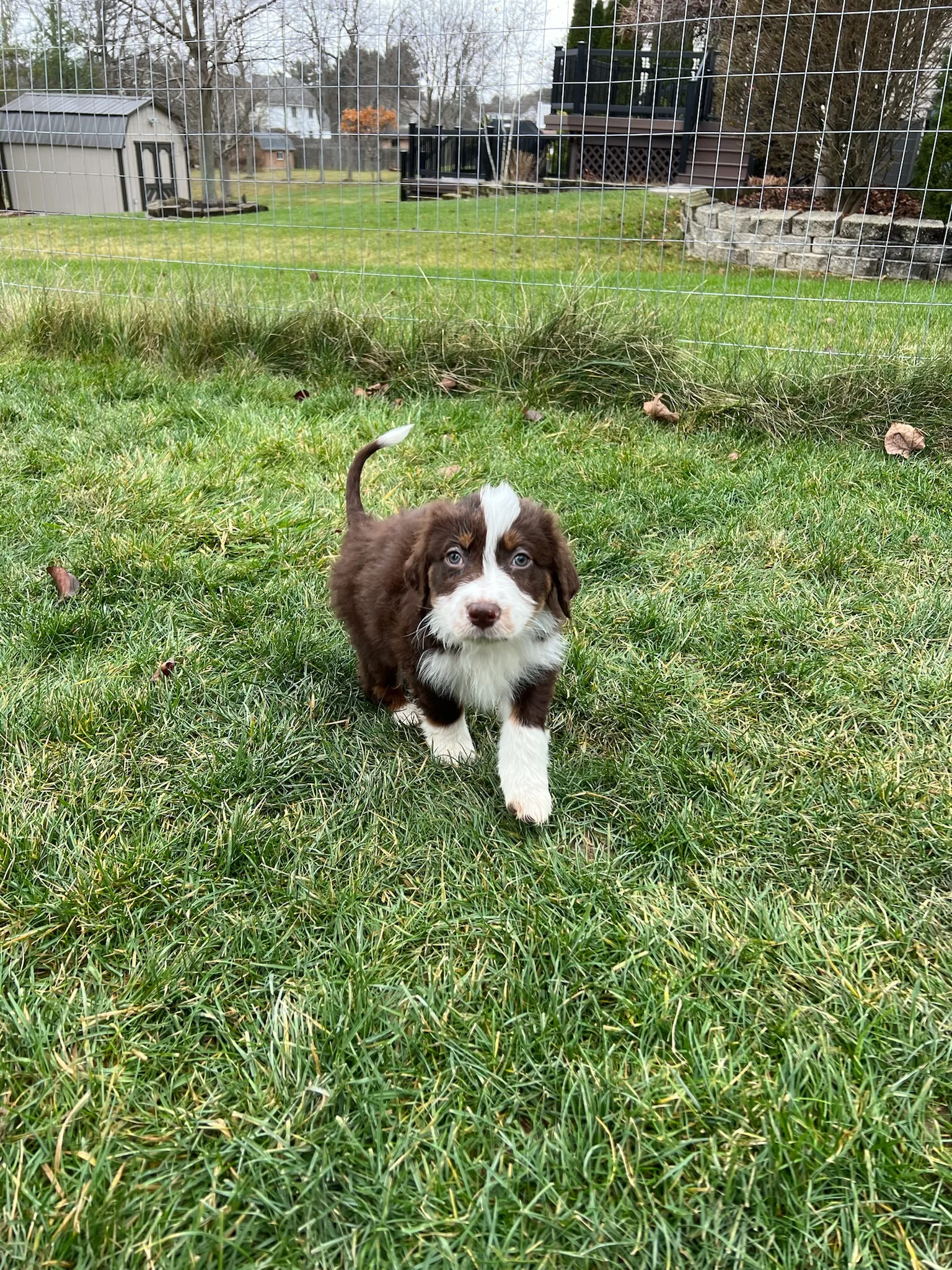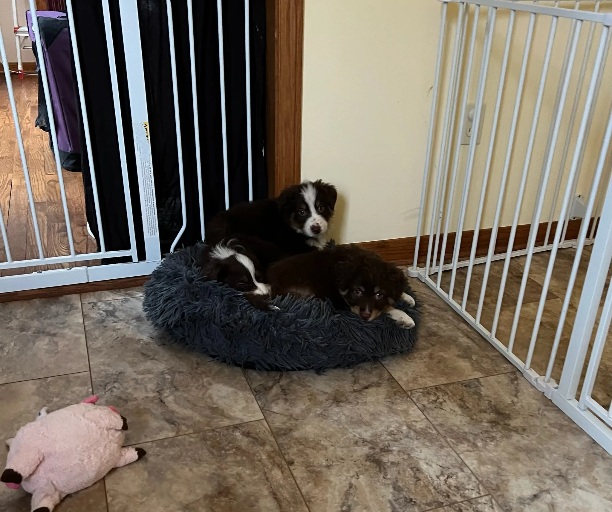 When we first got them, Scout, Mollie, and Colton had kennel cough. Colton got sick, which I talk about more below. Mollie was very fluffy but skinny, so she could squeeze through the bars in our omni-pen. We had to wrap an X-pen around the omni-pen. She learned how to climb the X-pen right before she was adopted, but she had grown enough that she couldn’t squeeze through the omni-pen any longer thankfully.