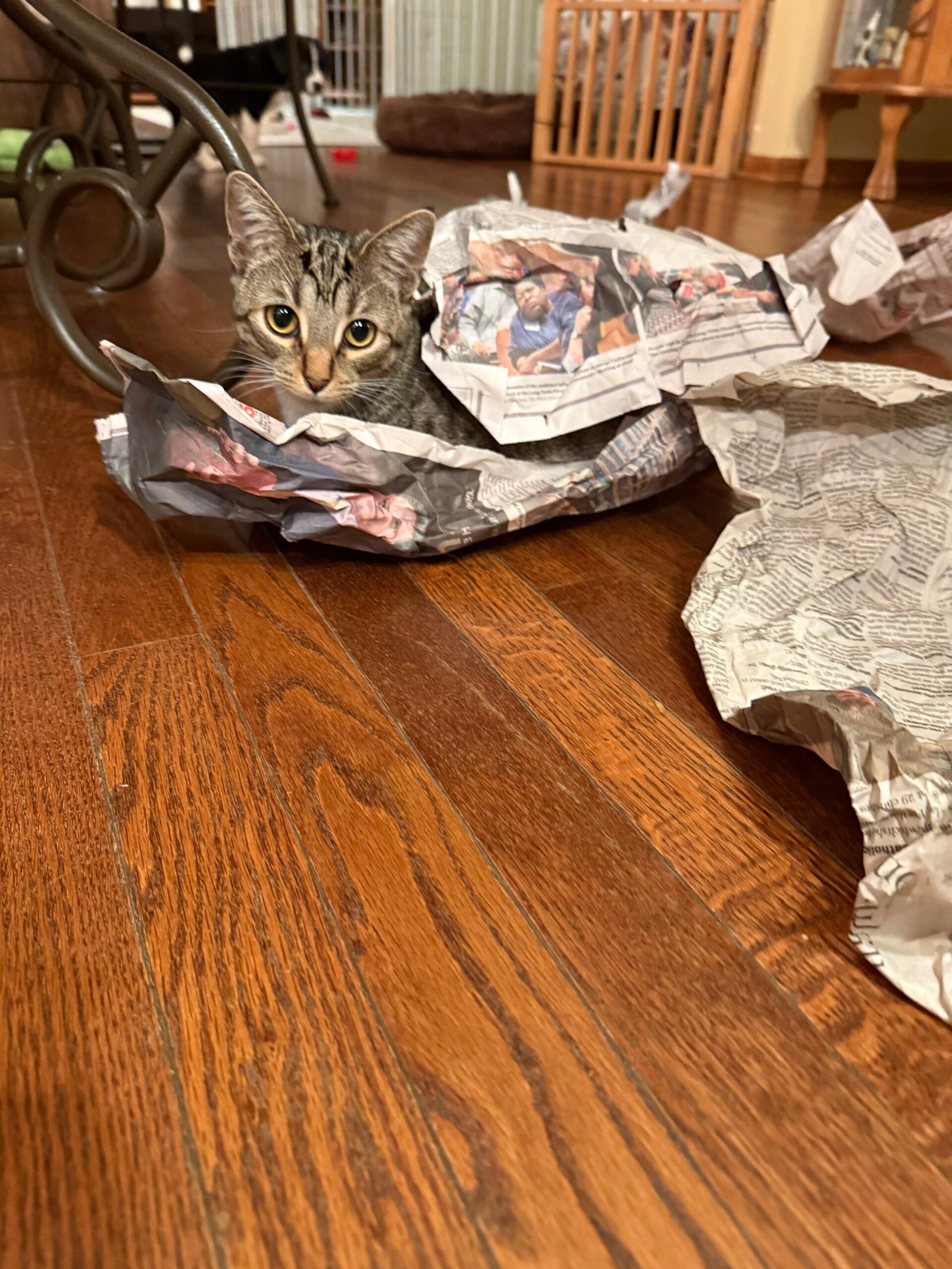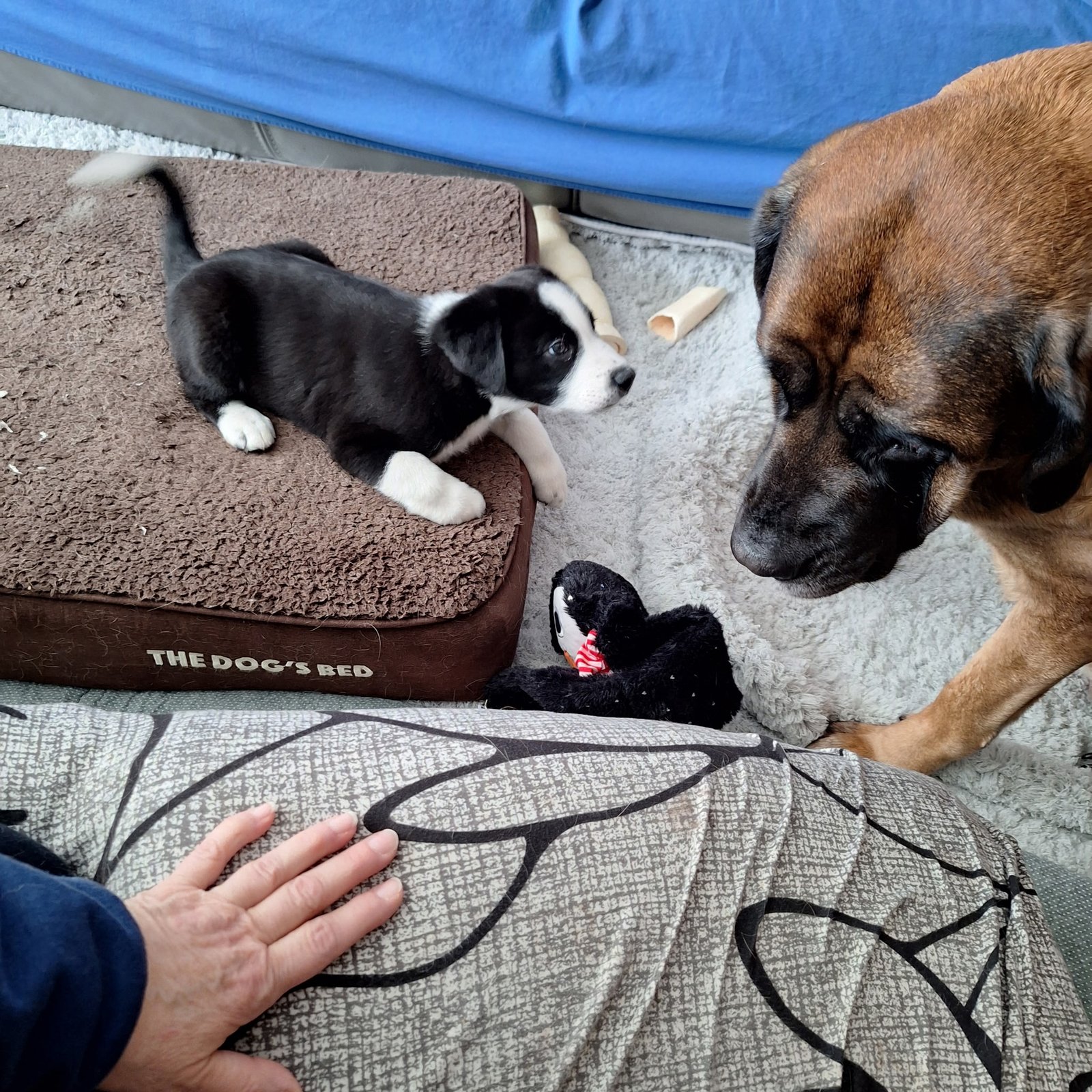 Then there’s Boots, our cat who truly believes she’s part dog. She loves to mess with the puppies, often sprawling across the kitchen floor like she’s daring them to inch closer. And our cat Olive? She makes the occasional royal appearance just to establish that she’s in charge 😾. And who is this strange glass dog? He doesn’t seem to want to play!