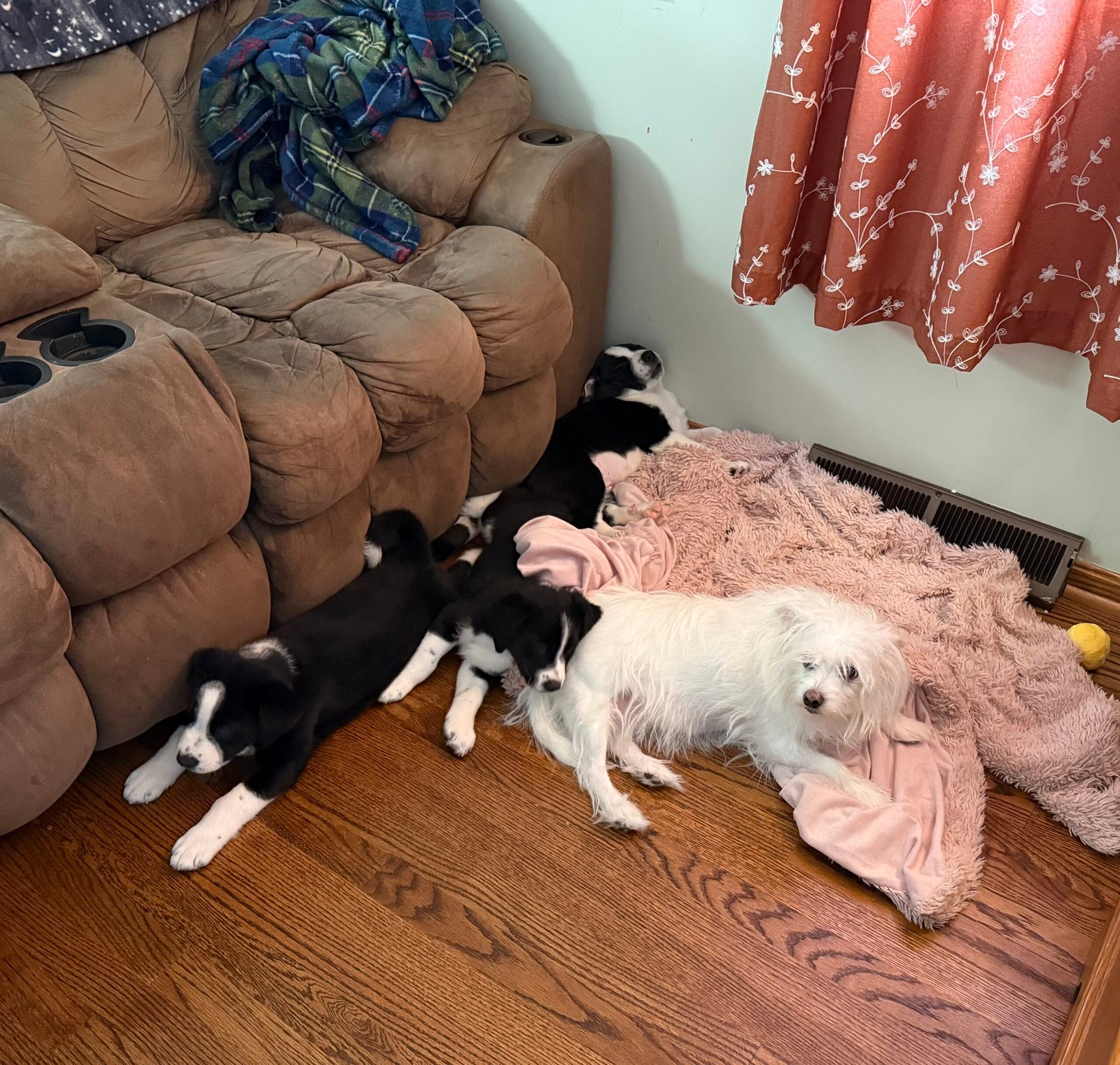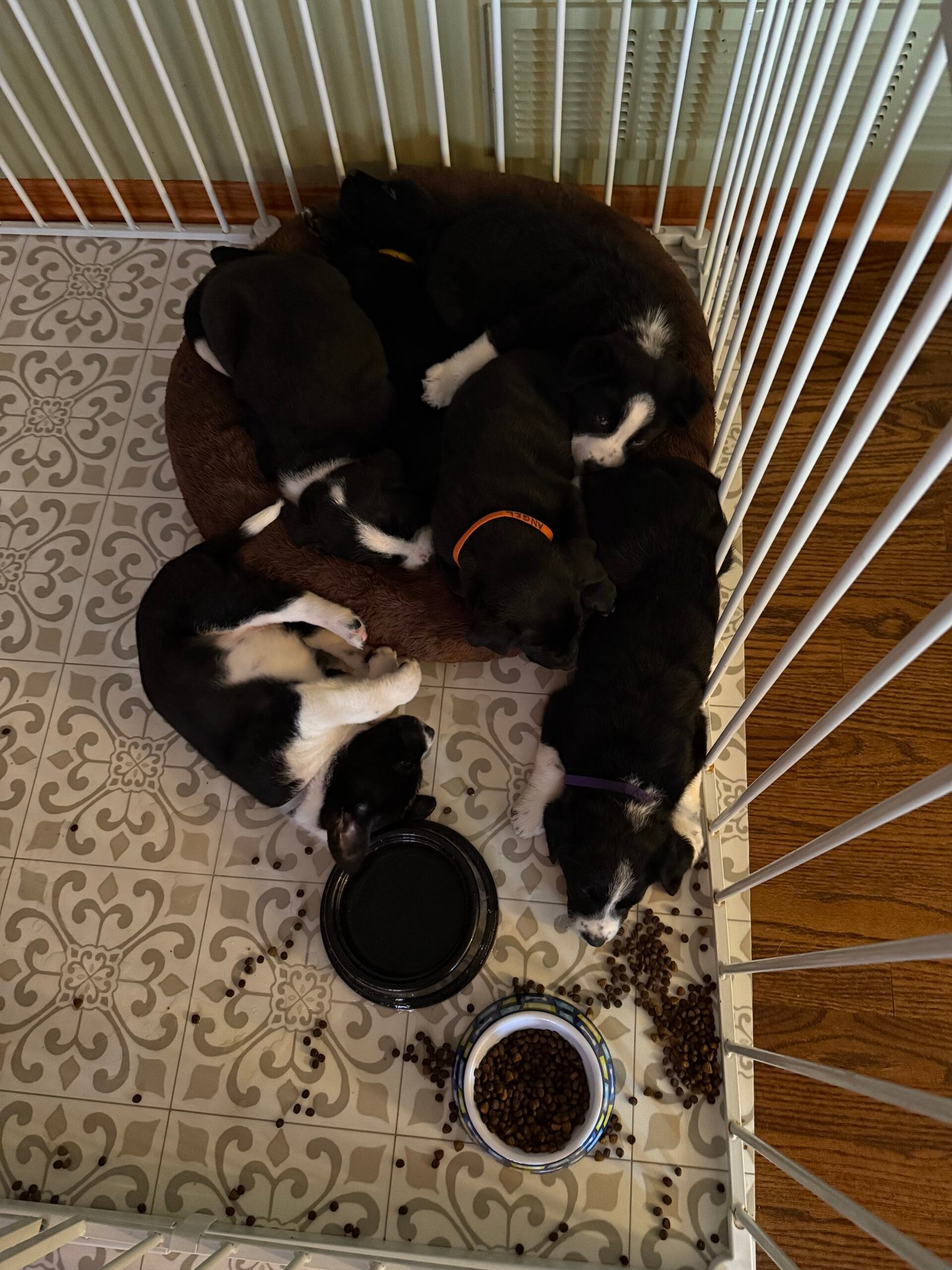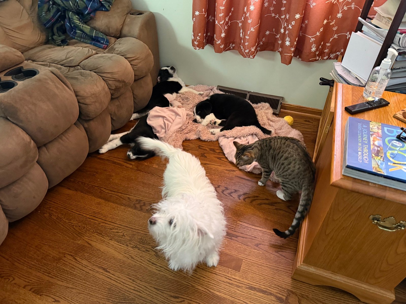 The plan was to split fostering duties: we’d take all six temporarily and then place three with another Geauga Mama Dog’s foster. But they were so sweet and mellow that I wanted to keep them all until they were adopted. I changed my mind the second morning when their pen was a complete poop-a-palooza! I cleaned up the mess, made my tea and came back to poop-a-palooza part Two! Plus they had rolled in it! 💩 So, it was back to cleaning, followed by some impromptu baths, and finally a post on our Facebook page requesting backup foster help. 🤣