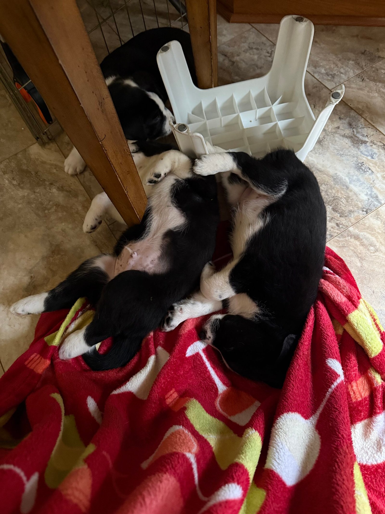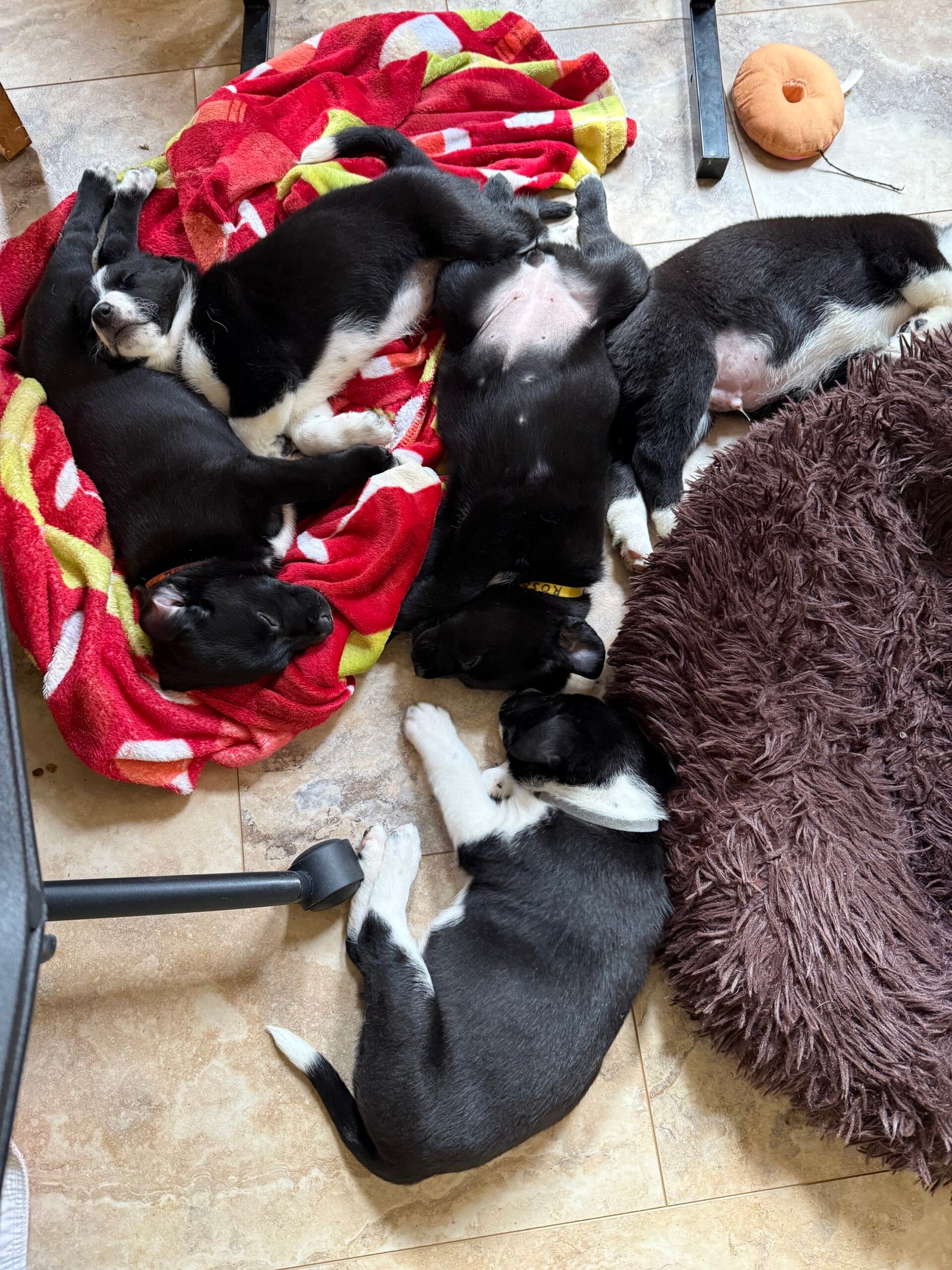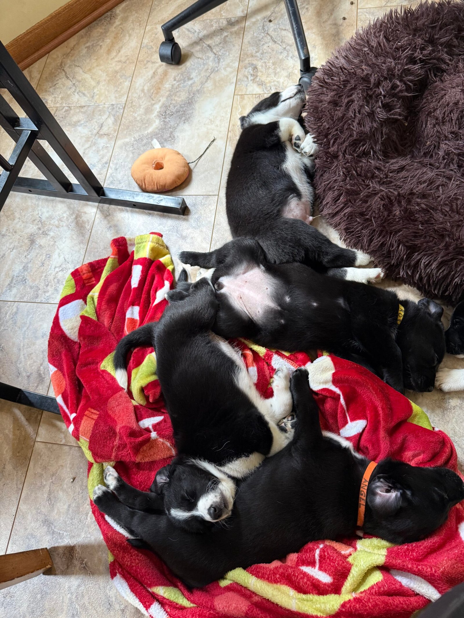 The plan was to split fostering duties: we’d take all six temporarily and then place three with another Geauga Mama Dog’s foster. But they were so sweet and mellow that I wanted to keep them all until they were adopted. I changed my mind the second morning when their pen was a complete poop-a-palooza! I cleaned up the mess, made my tea and came back to poop-a-palooza part Two! Plus they had rolled in it! 💩 So, it was back to cleaning, followed by some impromptu baths, and finally a post on our Facebook page requesting backup foster help. 🤣