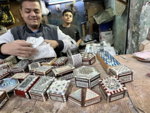 We contacted a local guide to take us to a few local craftsman shops in downtown Cairo. We also visited the historic mosque next door where his son went to school.
